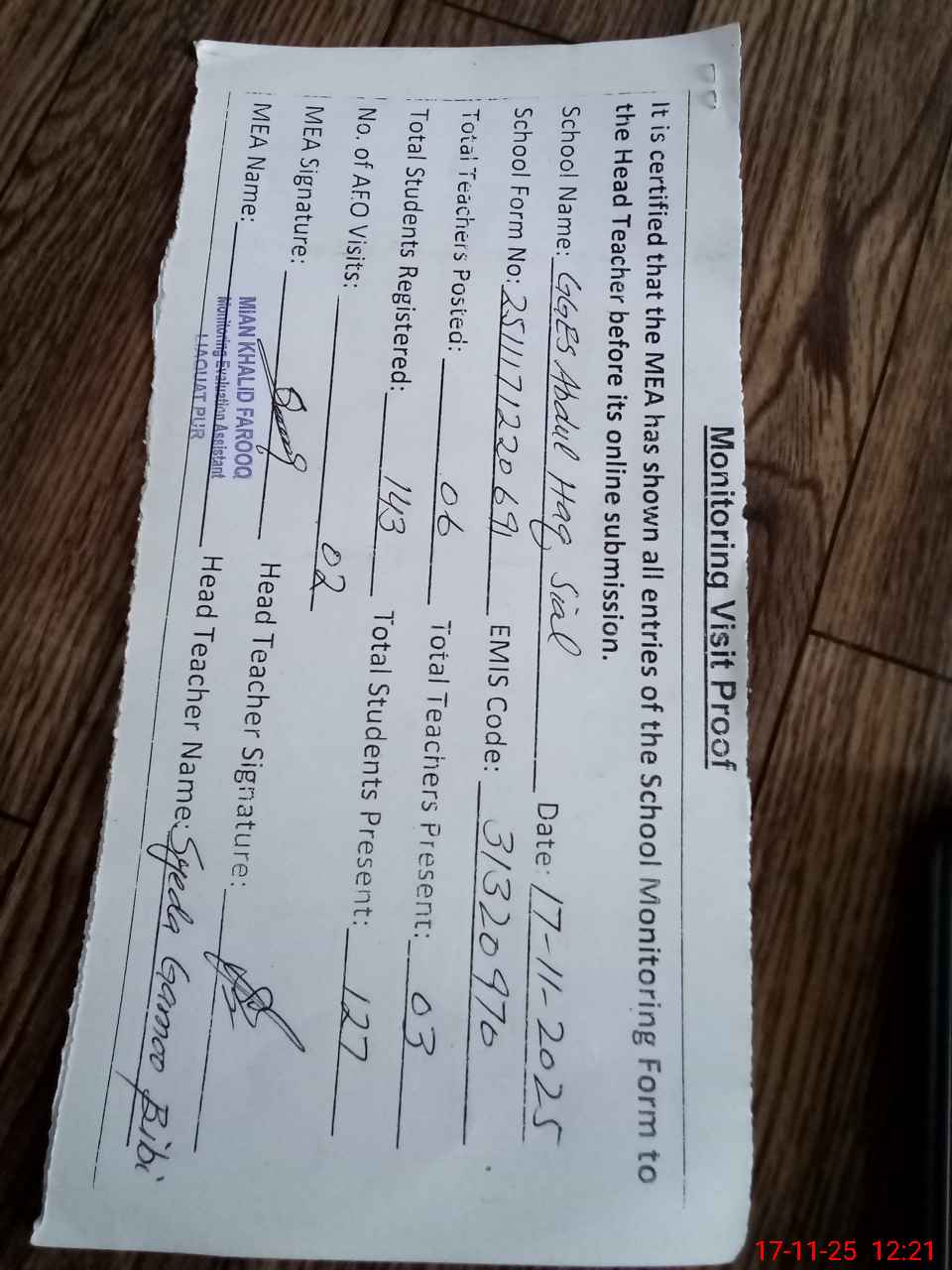 | EMIS Code: 31320970 | Name of School: GGES ABDUL HAQ SIAL | |||
