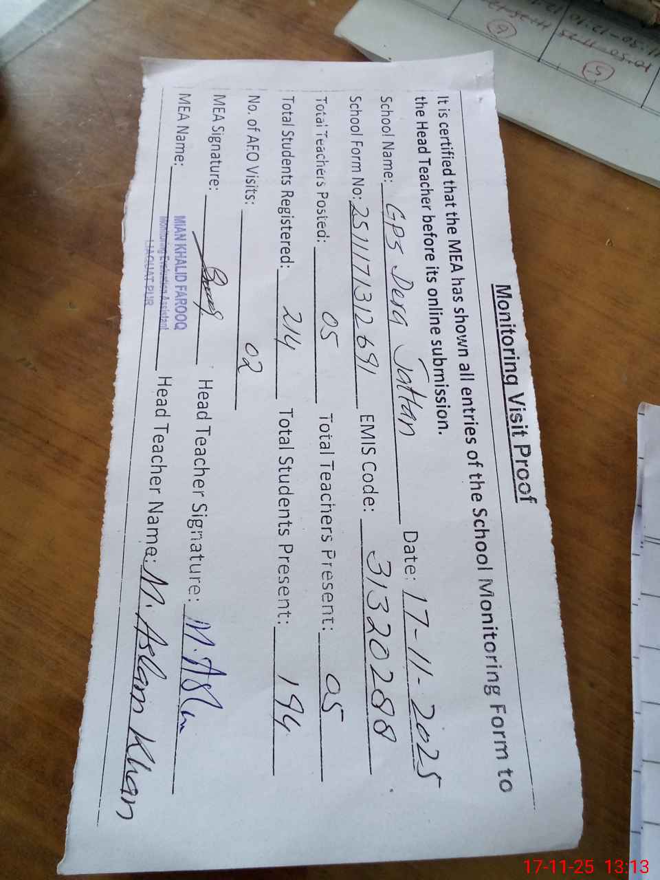 | EMIS Code: 31320288 | Name of School: GPS DERA JATTAN | |||