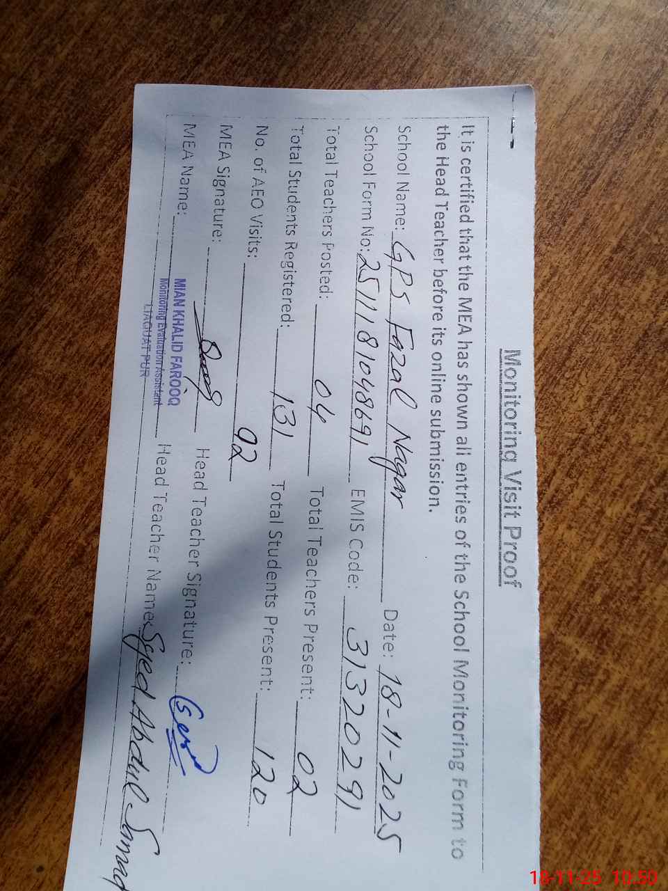 | Attendance Register | Head Teacher | MEA with School | Visit Proof |