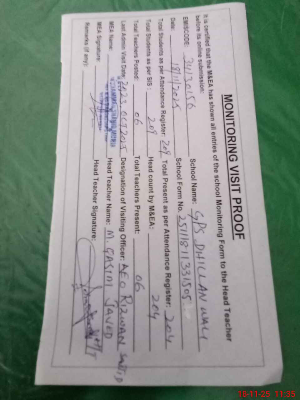 | EMIS Code: 34130156 | Name of School: GPS DHILLAN WALI | |||