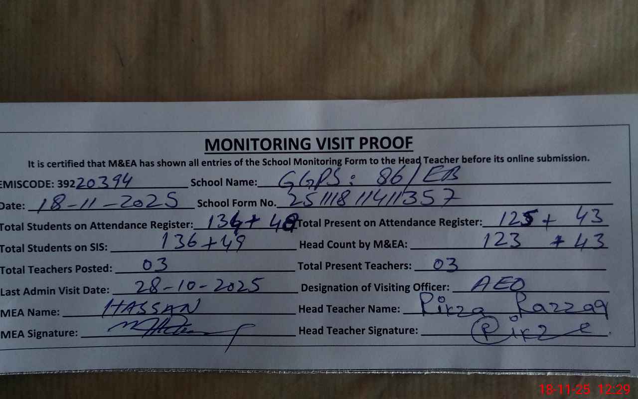 | EMIS Code: 39220394 | Name of School: GGPS 86/EB ARIFWALA | |||
