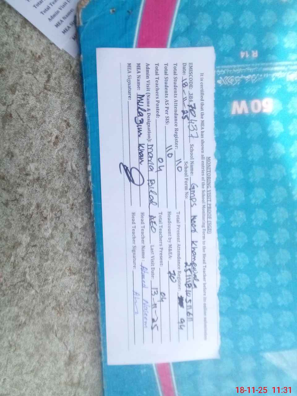 | Attendance Register | Head Teacher | MEA with School | Visit Proof |