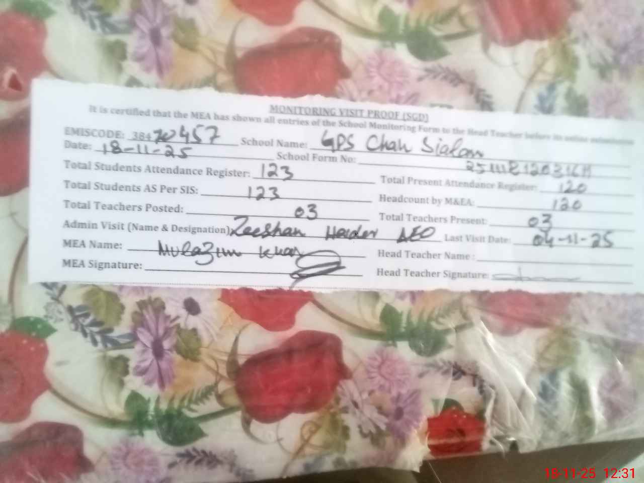 | Attendance Register | Head Teacher | MEA with School | Visit Proof |