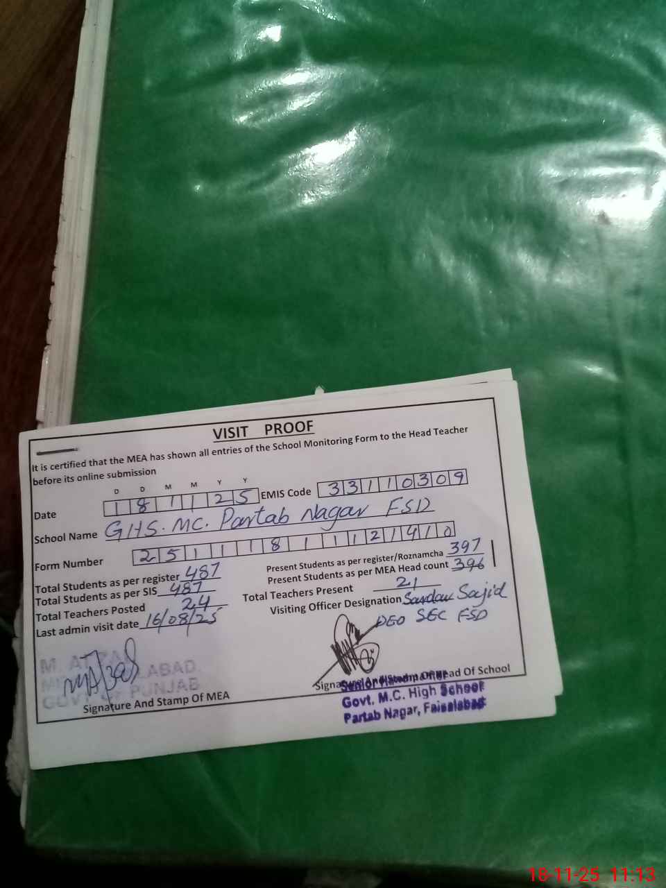 | Attendance Register | Head Teacher | MEA with School | Visit Proof |