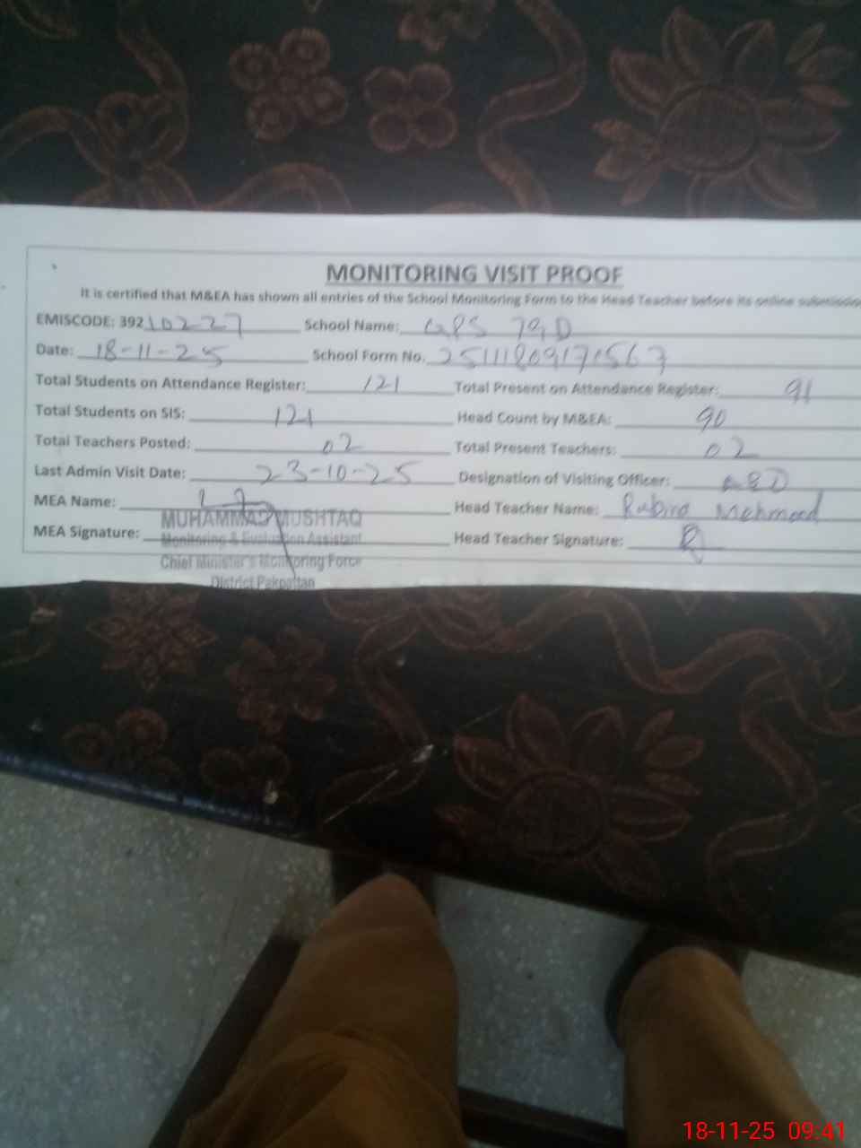 | Attendance Register | Head Teacher | MEA with School | Visit Proof |