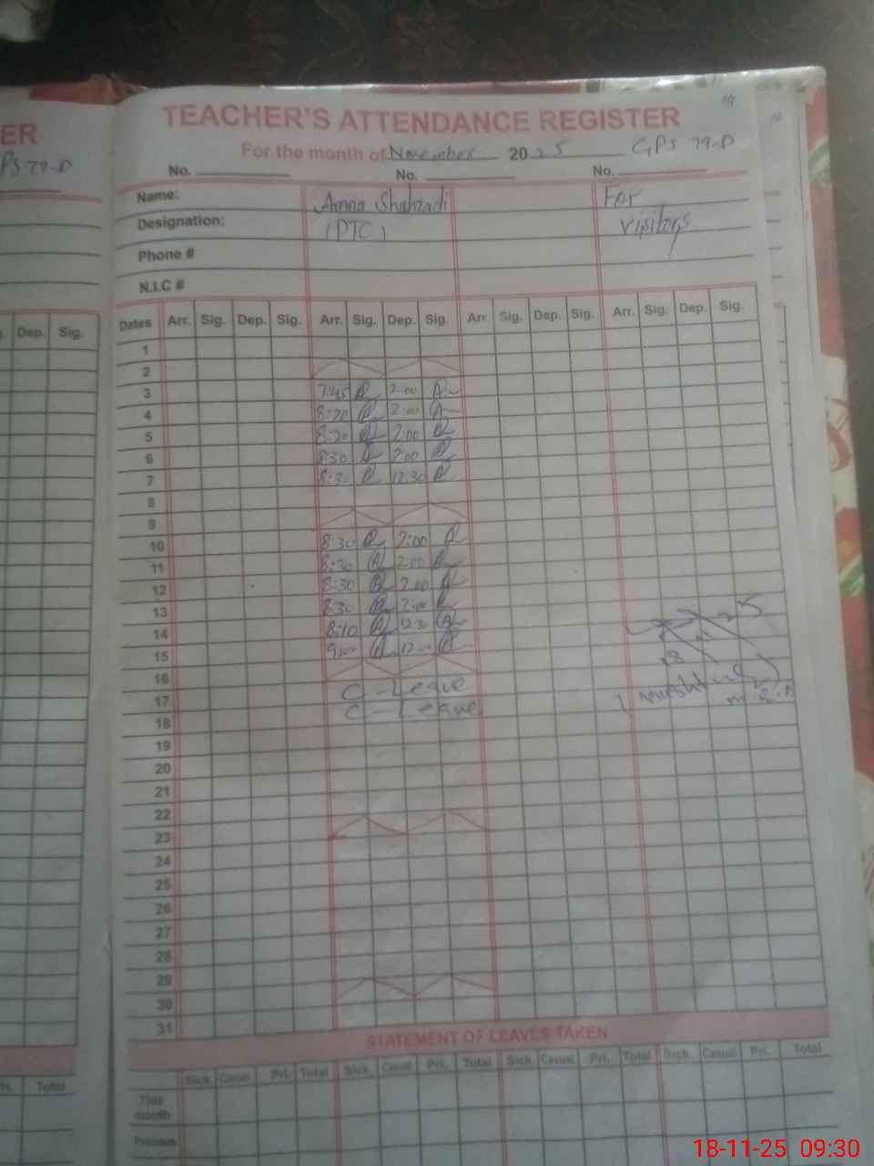 | CNIC | Full Name | Designation | R/C | Absence During Last Calender Month |