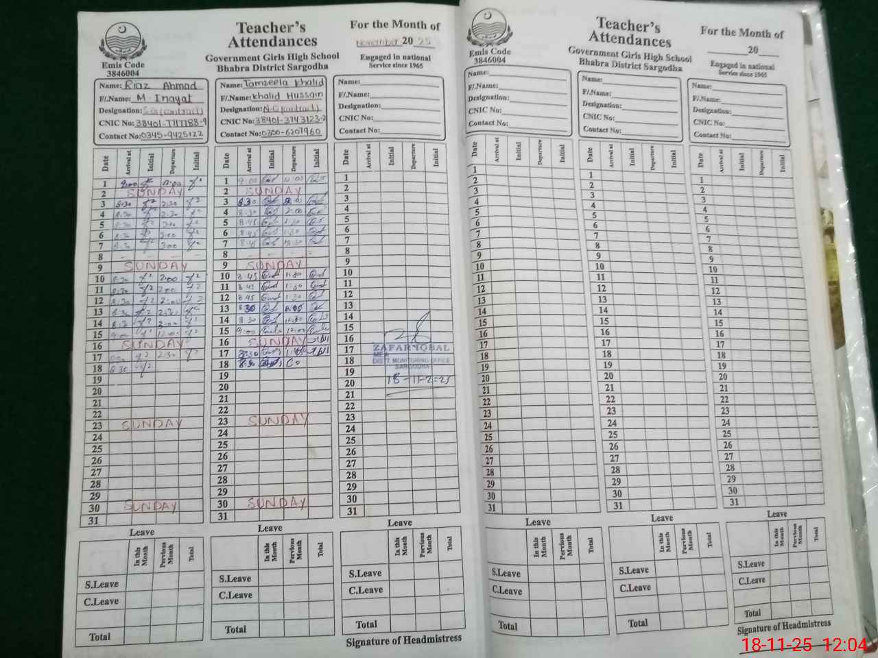 | CNIC | Full Name | Designation | R/C | Absence During Last Calender Month |