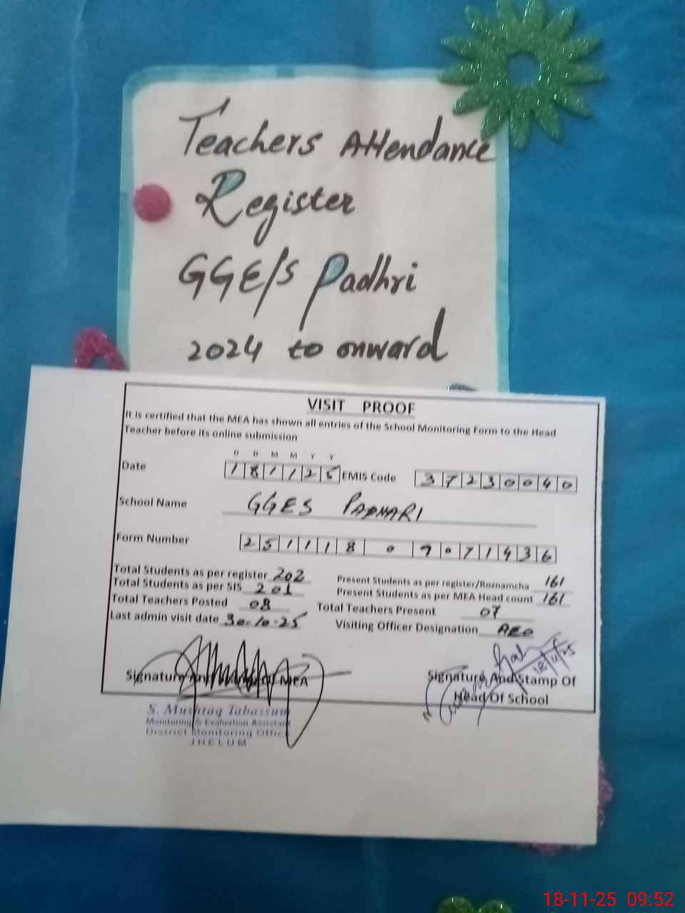 | Attendance Register | Head Teacher | MEA with School | Visit Proof |