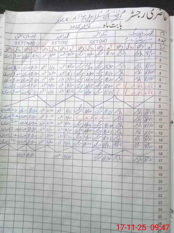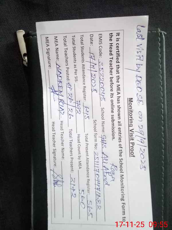 | Remarks (Use Separate Page if Required): Last visit by DEO SE Muhammad Arif on 29 September 2025 Two teachers named M Amjad Javed Khan EST and Muhammad Javed EST have joined during last ten days and their names are not included in PMIU App list | |||||