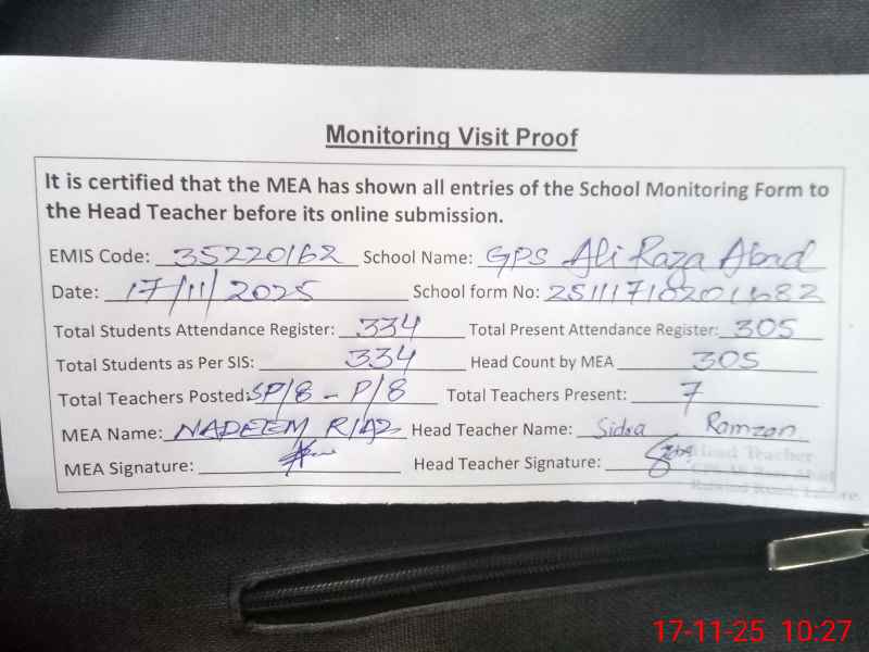 | EMIS Code: 35220162 | Name of School: GPS ALI RAZA ABAD TEHSIL MODEL TOWN | |||