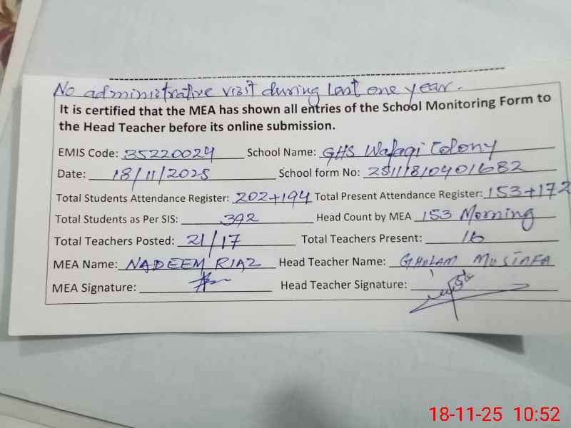 | EMIS Code: 35220024 | Name of School: GHS WAFAQI COLONY LAHORE | |||