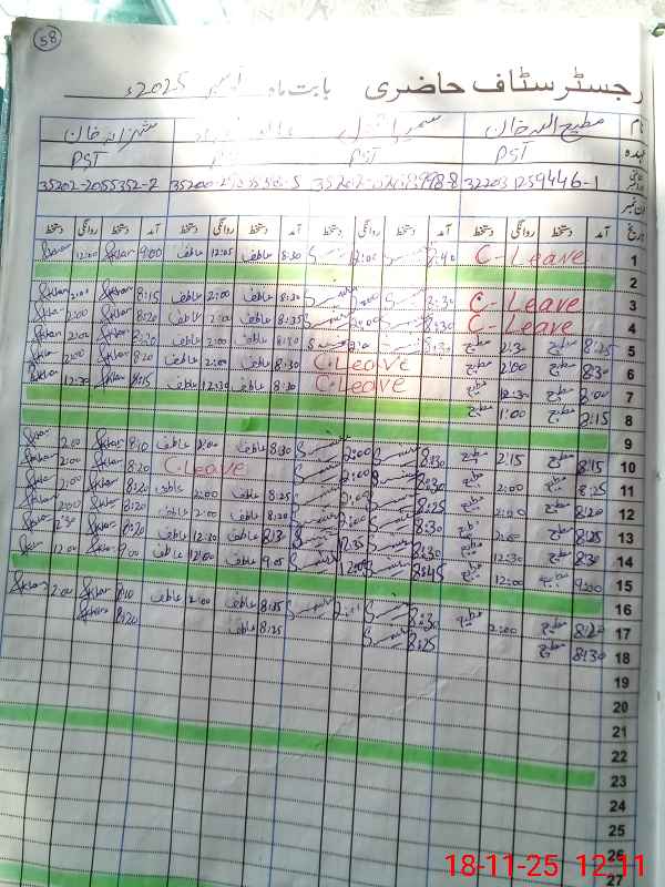 | CNIC | Full Name | Designation | R/C | Absence During Last Calender Month |