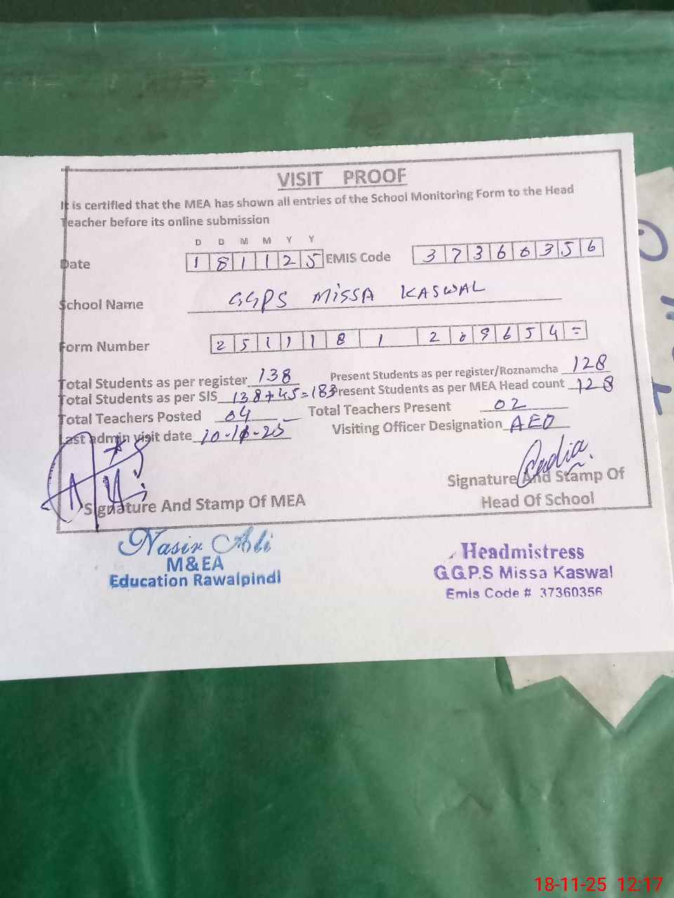 | Attendance Register | Head Teacher | MEA with School | Visit Proof |