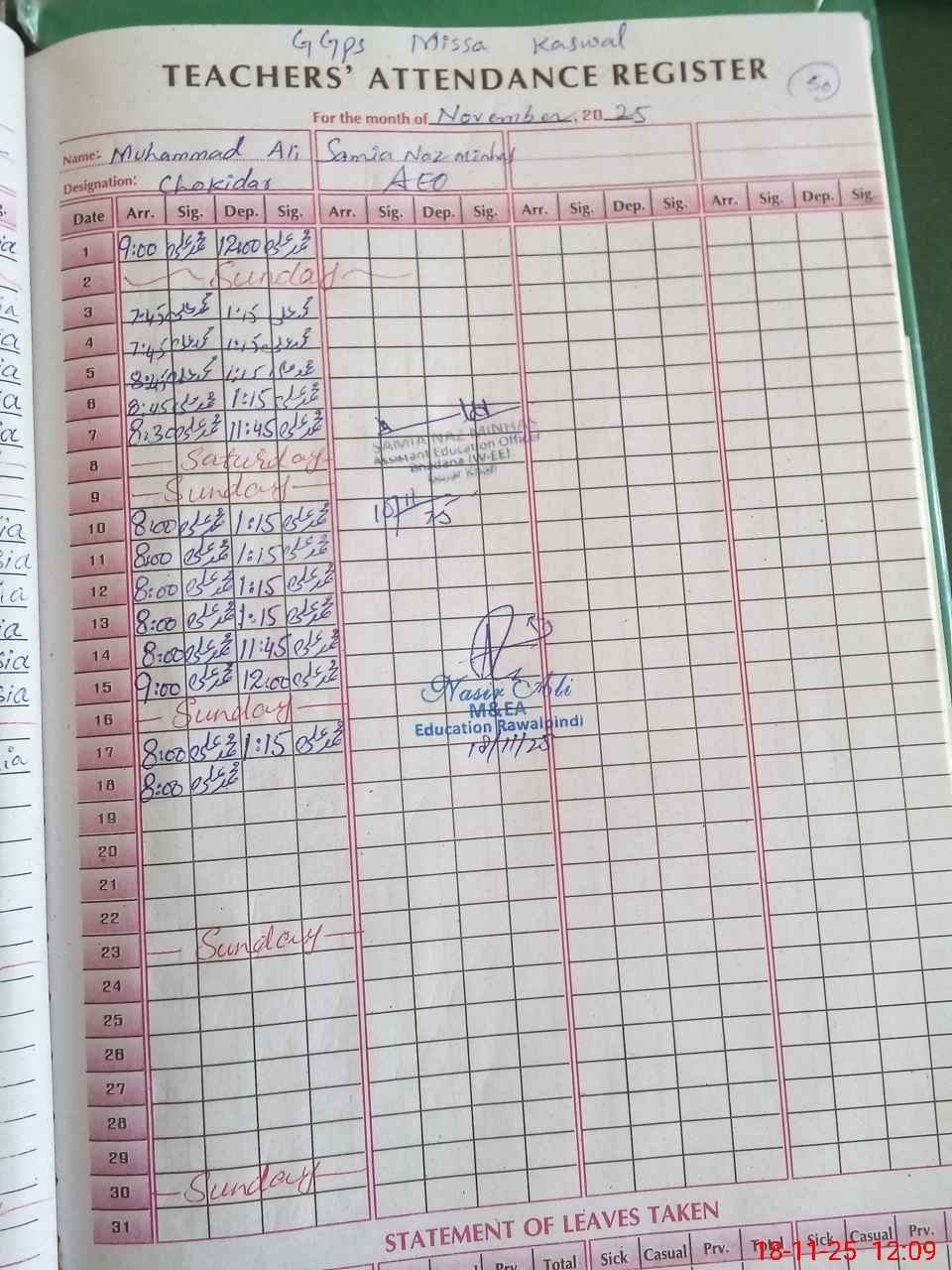 | CNIC | Full Name | Designation | R/C | Absence During Last Calender Month |