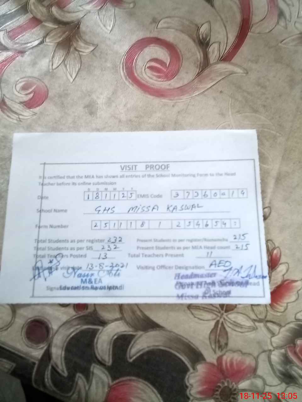 | Attendance Register | Head Teacher | MEA with School | Visit Proof |