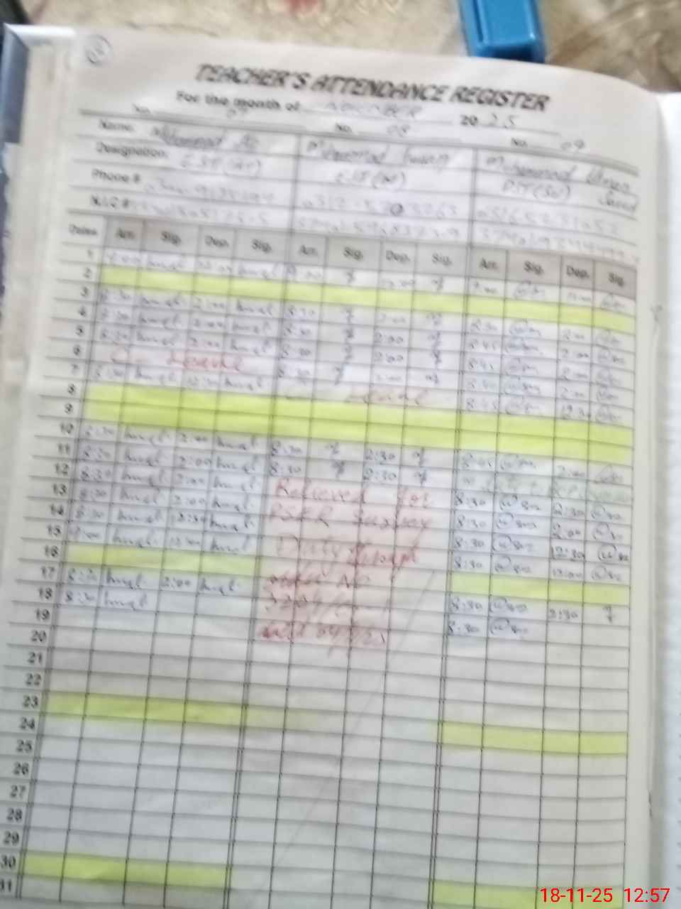 | CNIC | Full Name | Designation | R/C | Absence During Last Calender Month |