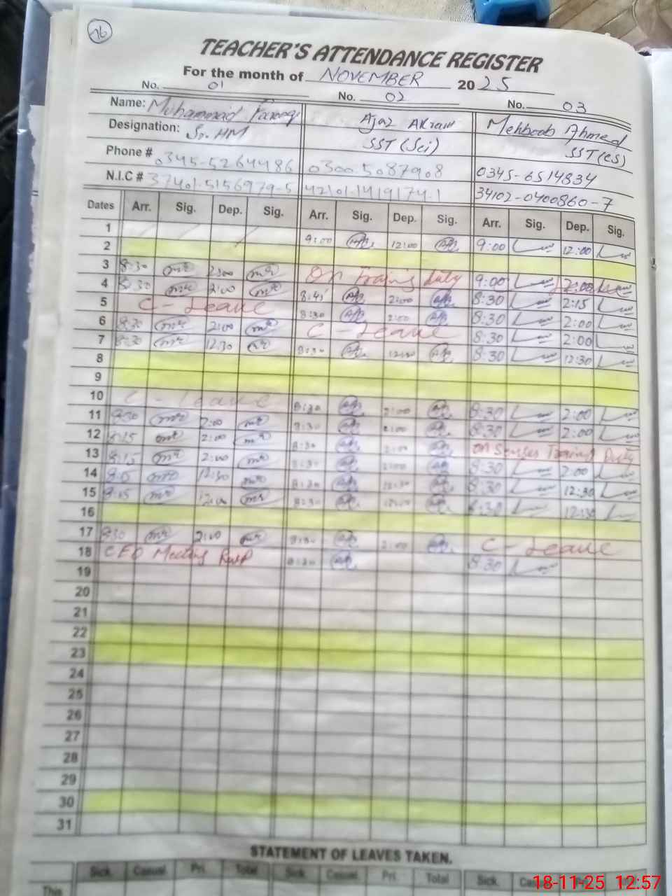 | CNIC | Full Name | Designation | R/C | Absence during last cal. month |