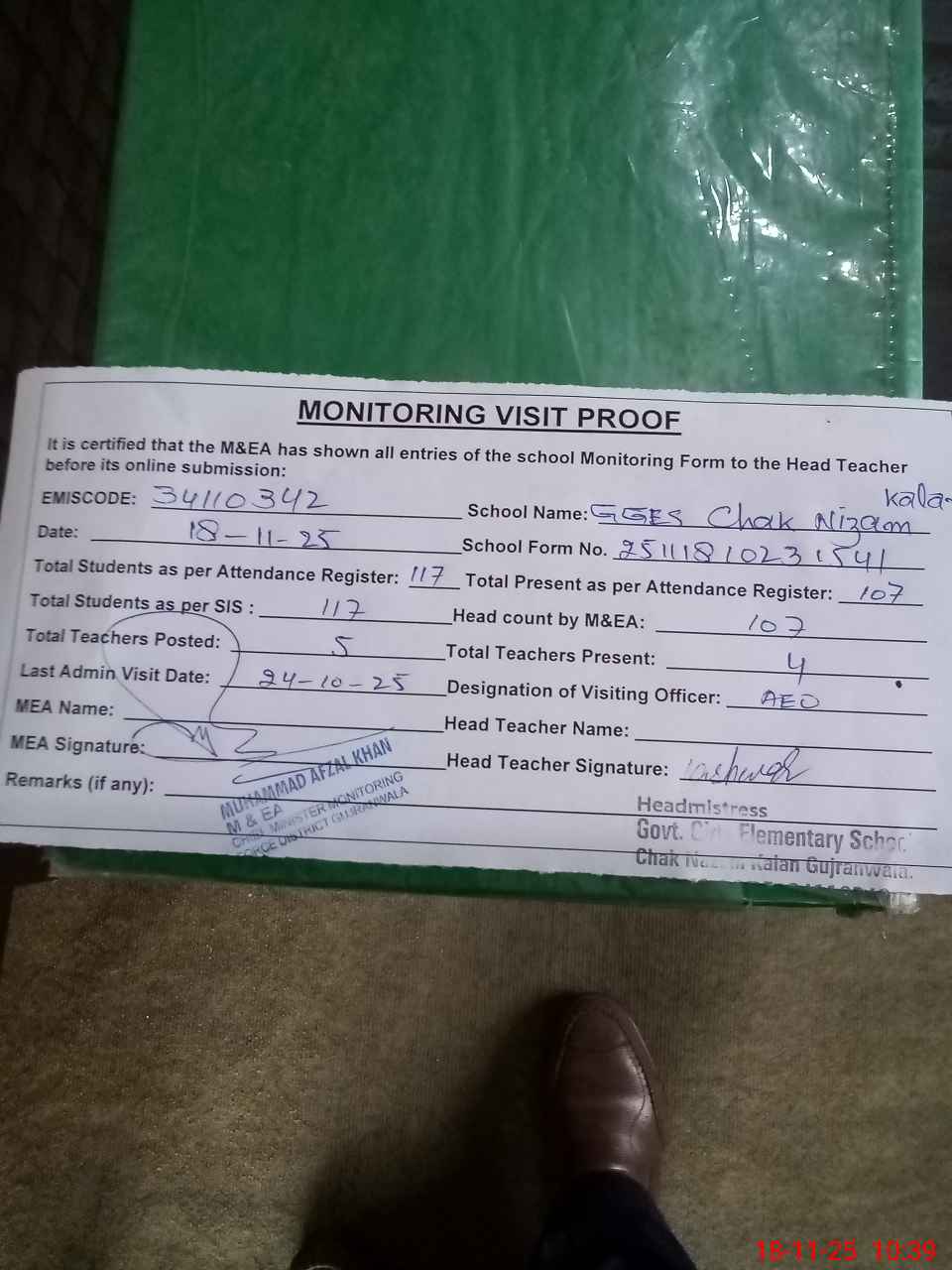| Monitoring Date: 18-11-2025 | Start Time: 18-11-2025 10:00 AM | End Time: 18-11-2025 10:39 AM | Name of MEA: N-**** Af**** Kh**** | |