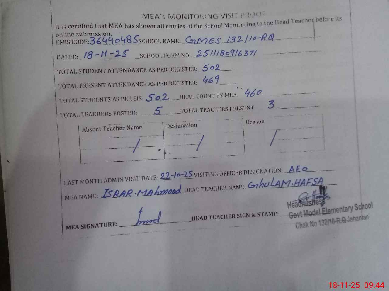 | EMIS Code: 36440485 | Name of School: GMES 132/10-R QADEEM, JAHANIAN | |||