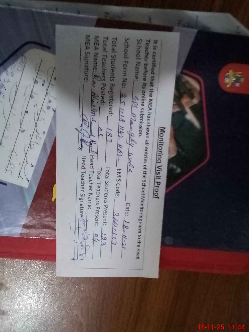 | Attendance Register | Head Teacher | MEA with School | Visit Proof |