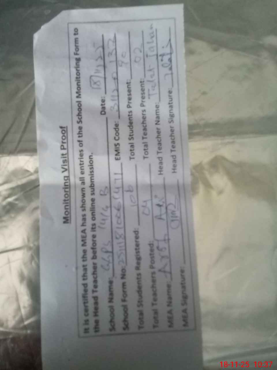 | Attendance Register | Head Teacher | MEA with School | Visit Proof |