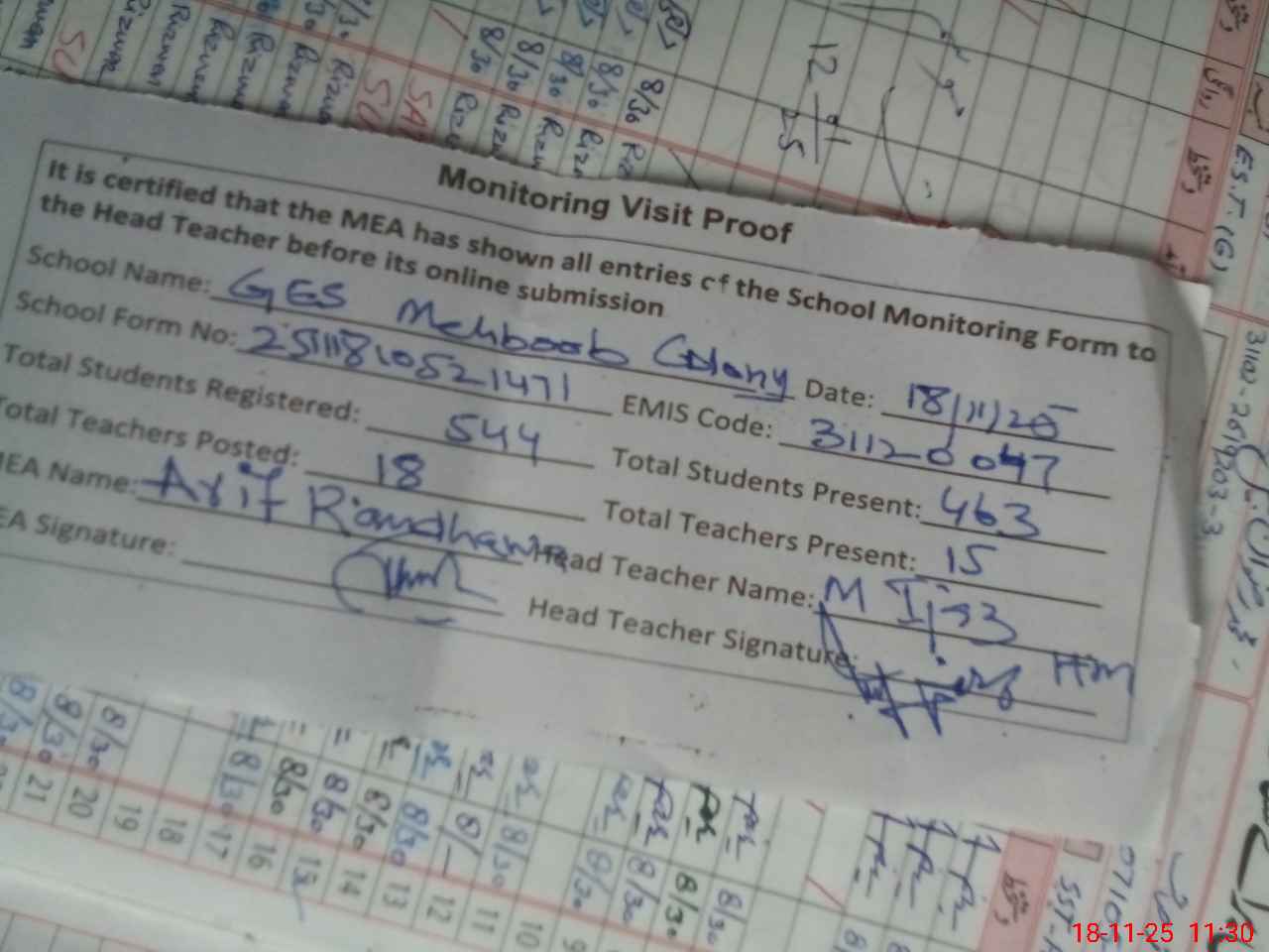 | Attendance Register | Head Teacher | MEA with School | Visit Proof |