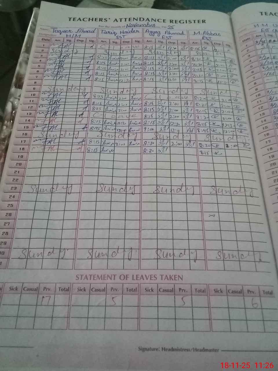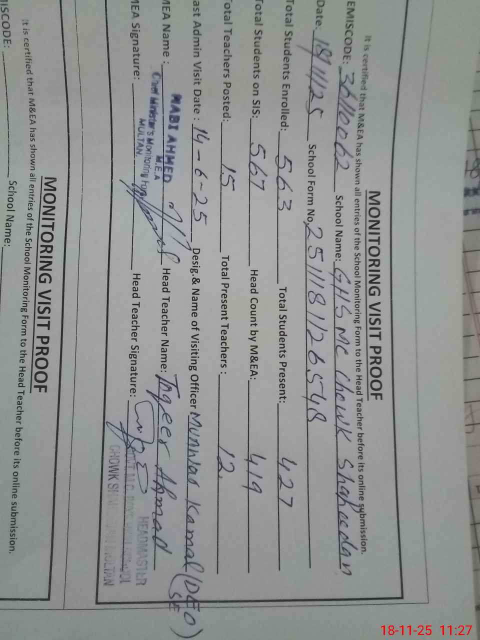| Attendance Register | Head Teacher | MEA with School | Visit Proof |