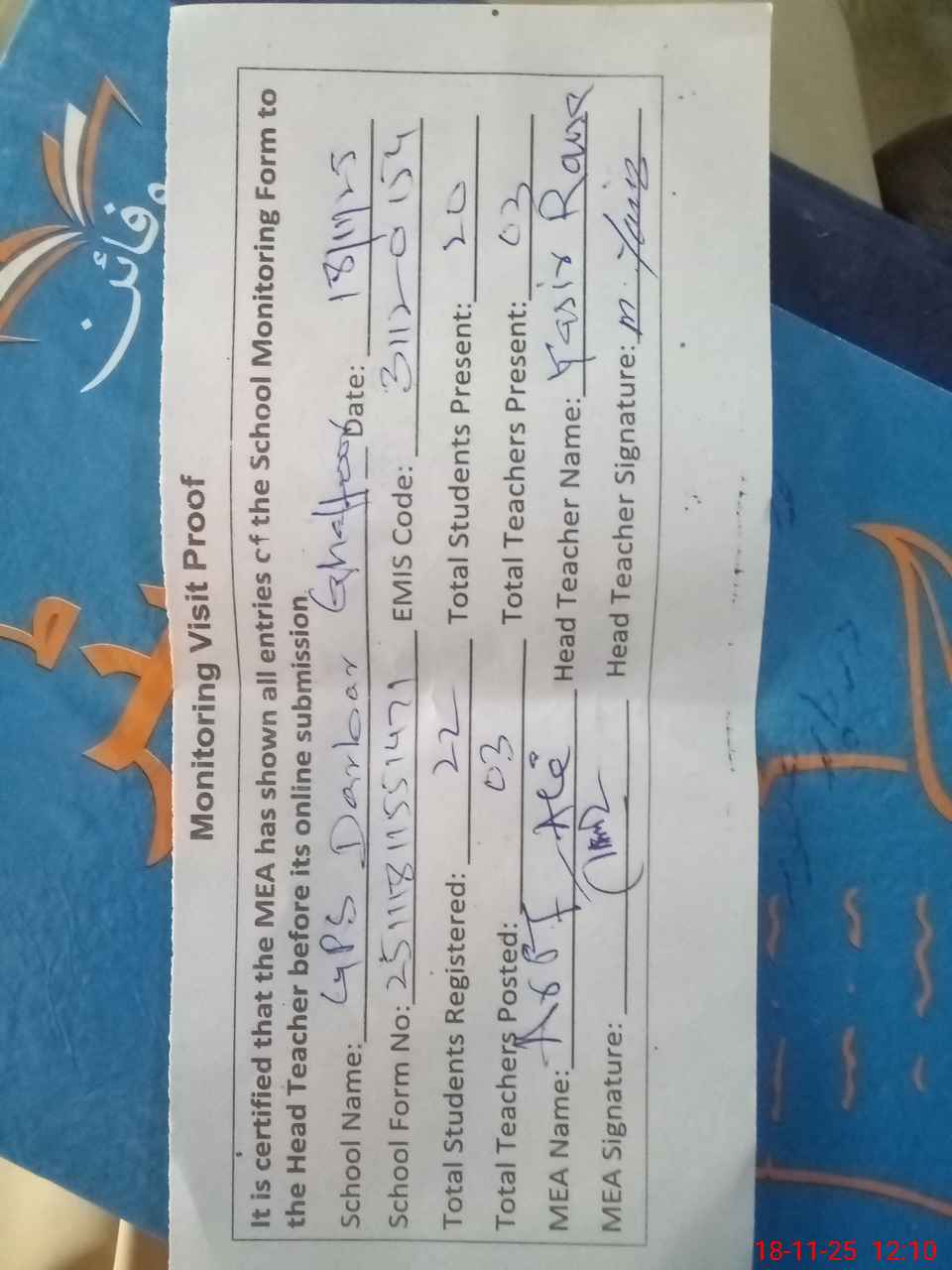 | EMIS Code: 31120154 | Name of School: GPS DARBAR GHAFOOR SHAH | |||