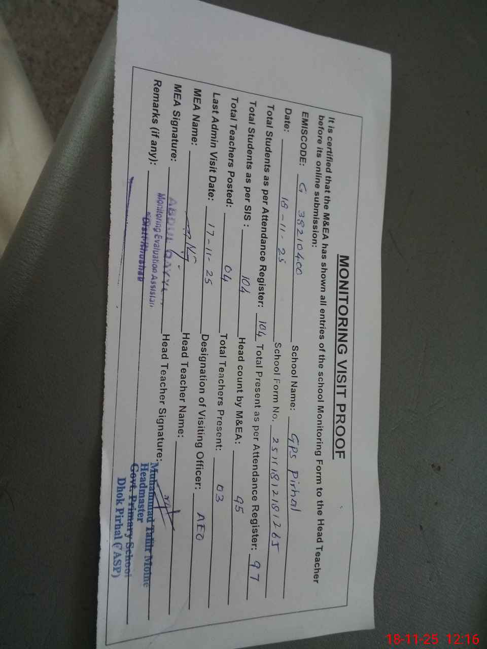 | Attendance Register | Head Teacher | MEA with School | Visit Proof |