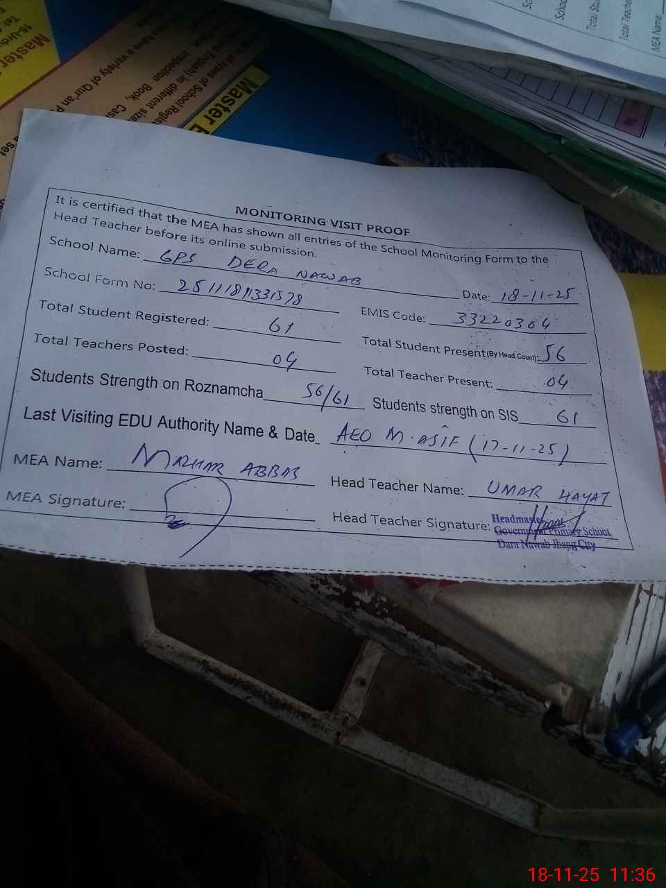 | Attendance Register | Head Teacher | MEA with School | Visit Proof |