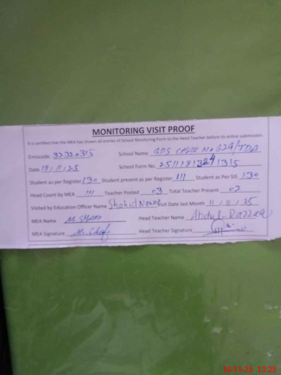 | Attendance Register | Head Teacher | MEA with School | Visit Proof |