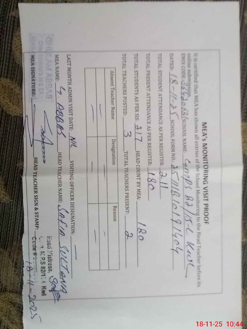 | Attendance Register | Head Teacher | MEA with School | Visit Proof |