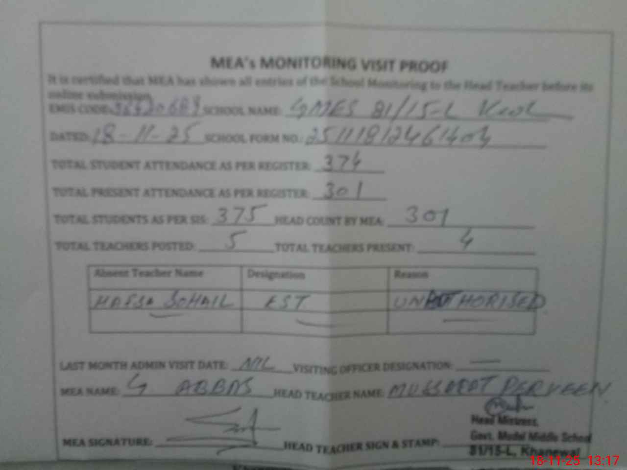 | Certified that this School was Inspected by the Undersigned MEA/DMO Today and the Information Stated Above is as Per Record. | |||||