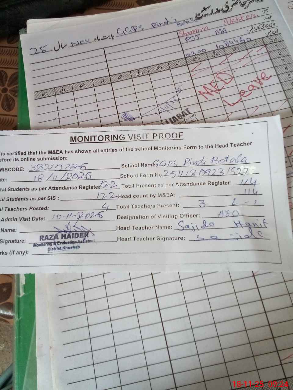 | Attendance Register | Head Teacher | MEA with School | Visit Proof |