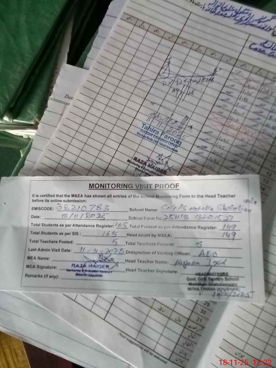 | Attendance Register | Head Teacher | MEA with School | Visit Proof |