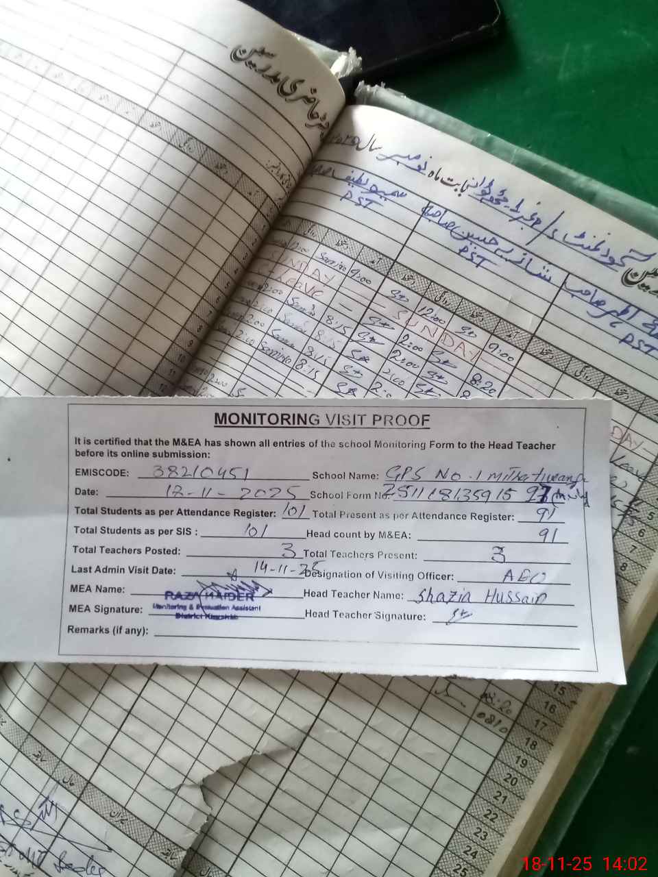 | Attendance Register | Head Teacher | MEA with School | Visit Proof |