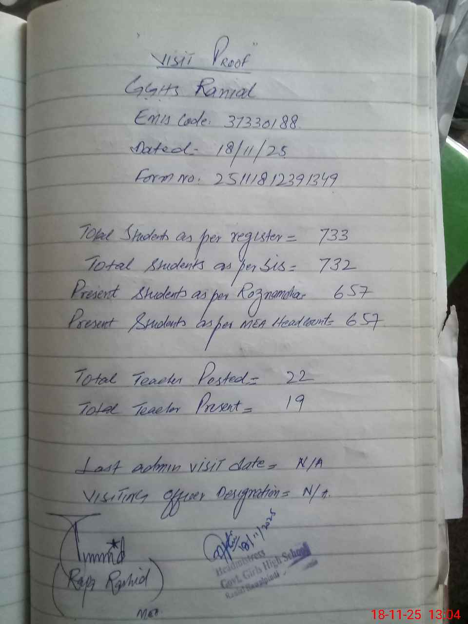 | Attendance Register | Head Teacher | MEA with School | Visit Proof |