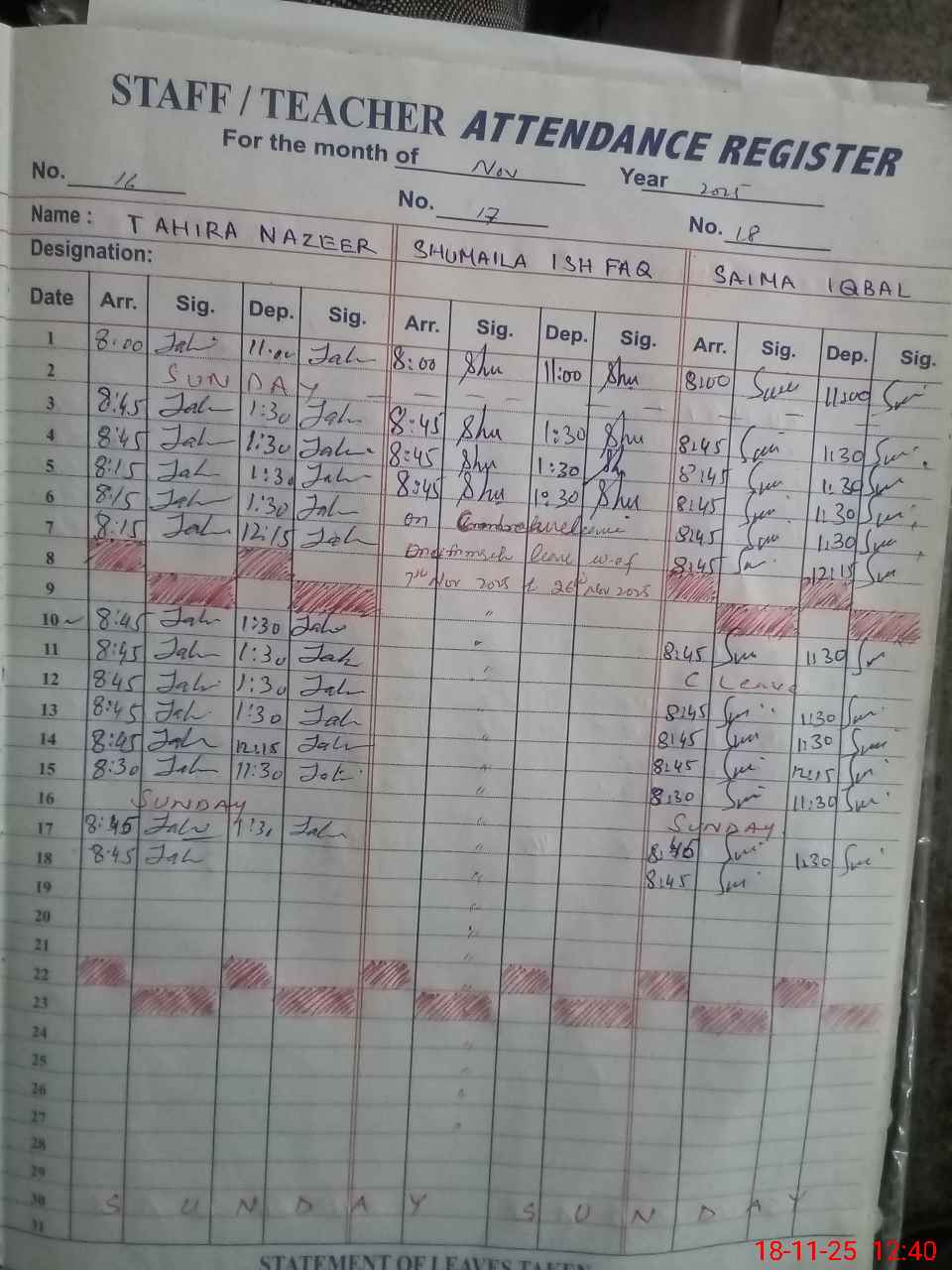| CNIC | Full Name | Designation | R/C | Absence During Last Calender Month |