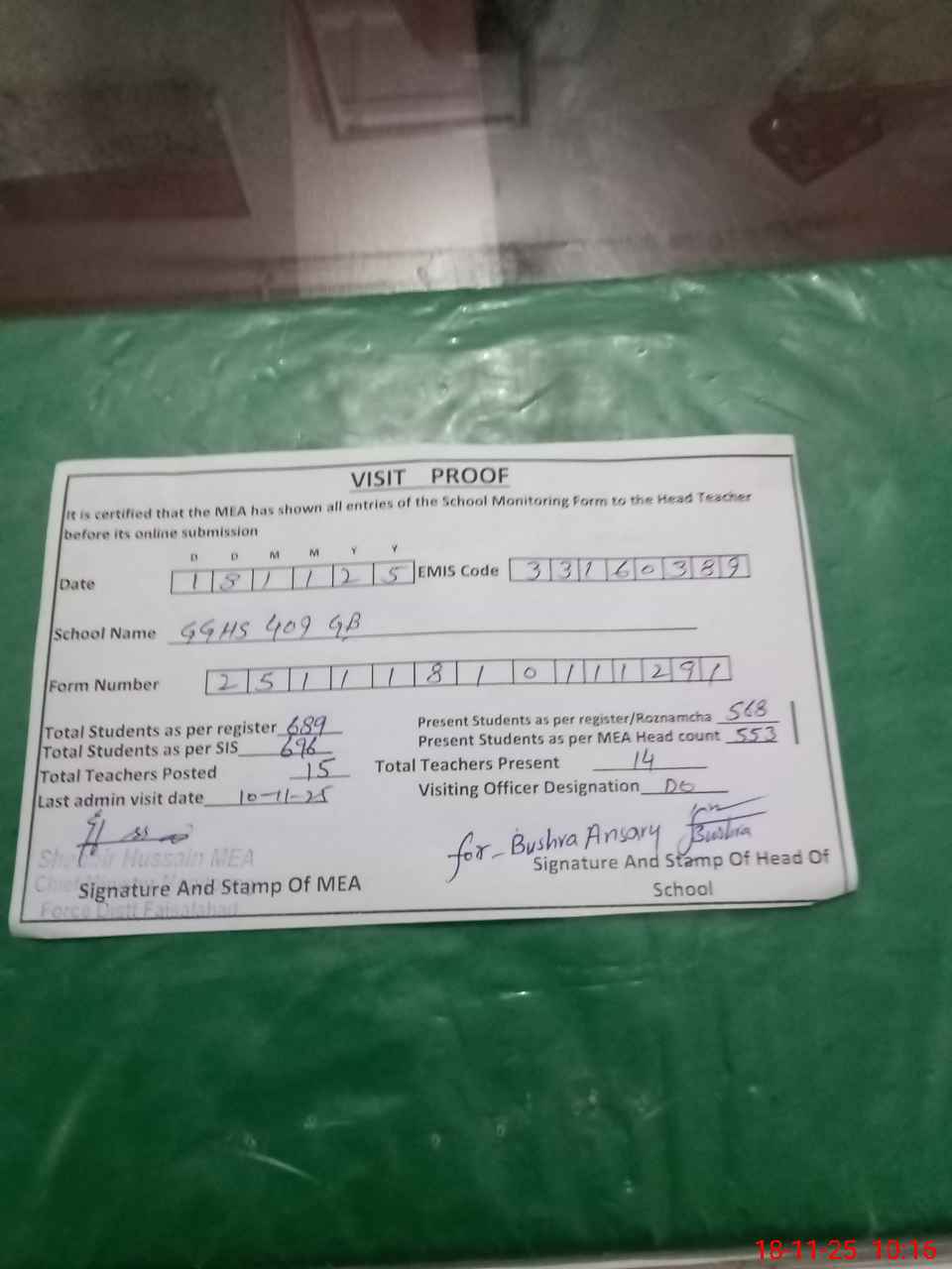| EMIS Code: 33160389 | Name of School: GGHS 409 GB TANDLIAN WALA | |||