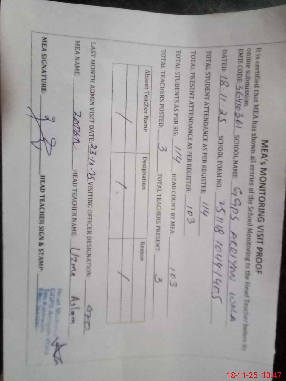 | Attendance Register | Head Teacher | MEA with School | Visit Proof |