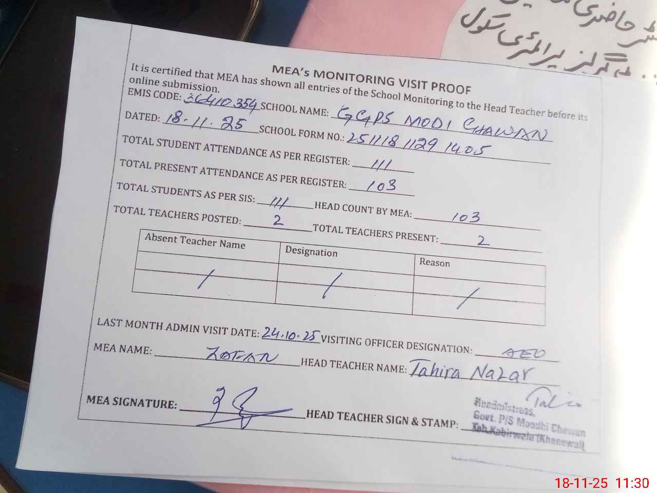 | Attendance Register | Head Teacher | MEA with School | Visit Proof |