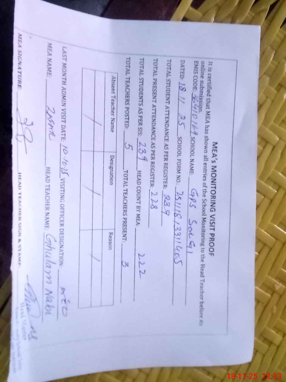 | EMIS Code: 36410169 | Name of School: GPS SOLGI, P/O JAWIND SING WALA, KABIRWALA | |||