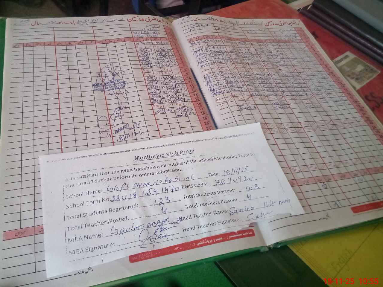 | Attendance Register | Head Teacher | MEA with School | Visit Proof |