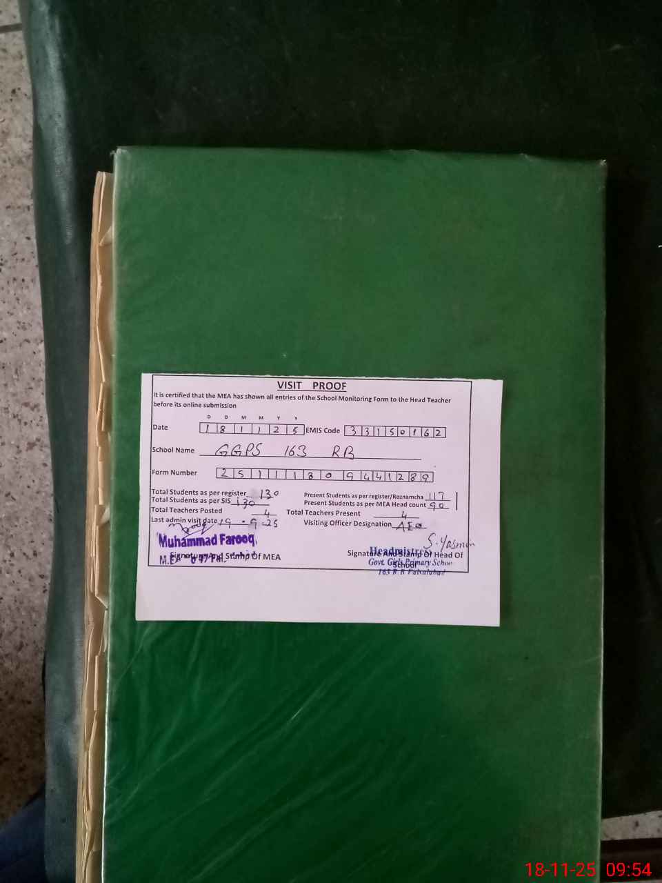 | Attendance Register | Head Teacher | MEA with School | Visit Proof |