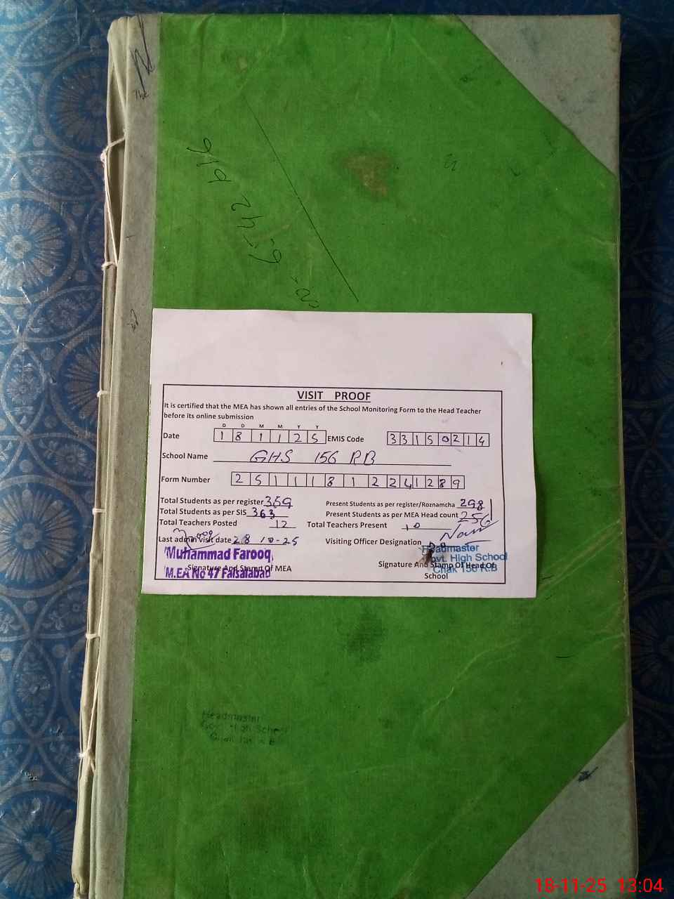 | EMIS Code: 33150214 | Name of School: GHS CHAK 156 RB CHAK JHUMRA FSD | |||