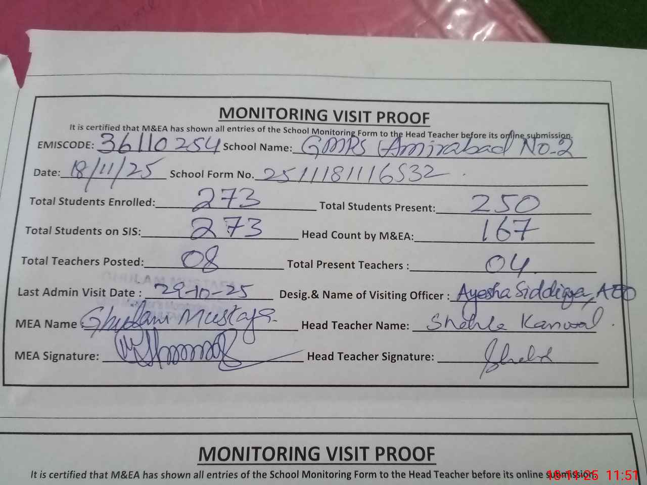 | Attendance Register | Head Teacher | MEA with School | Visit Proof |
