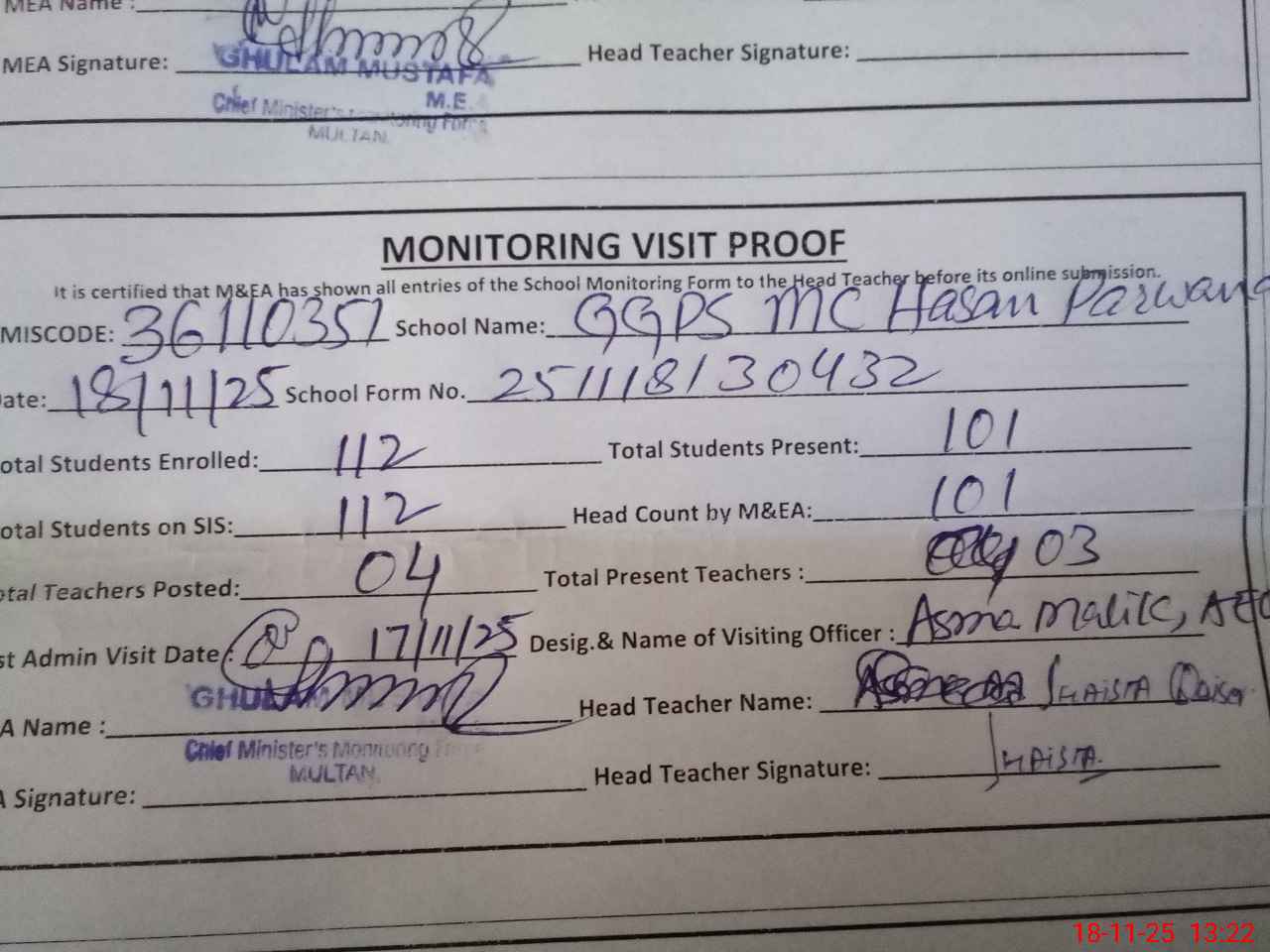 | Attendance Register | Head Teacher | MEA with School | Visit Proof |