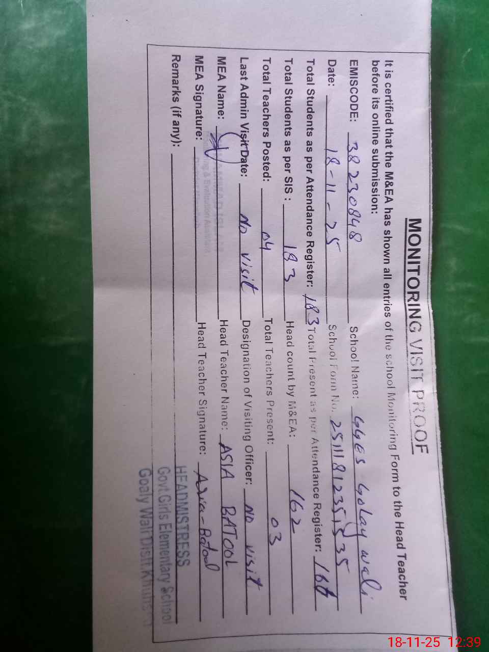 | Remarks (Use Separate Page if Required): No admin visit Students strength on sis 183 | |||||