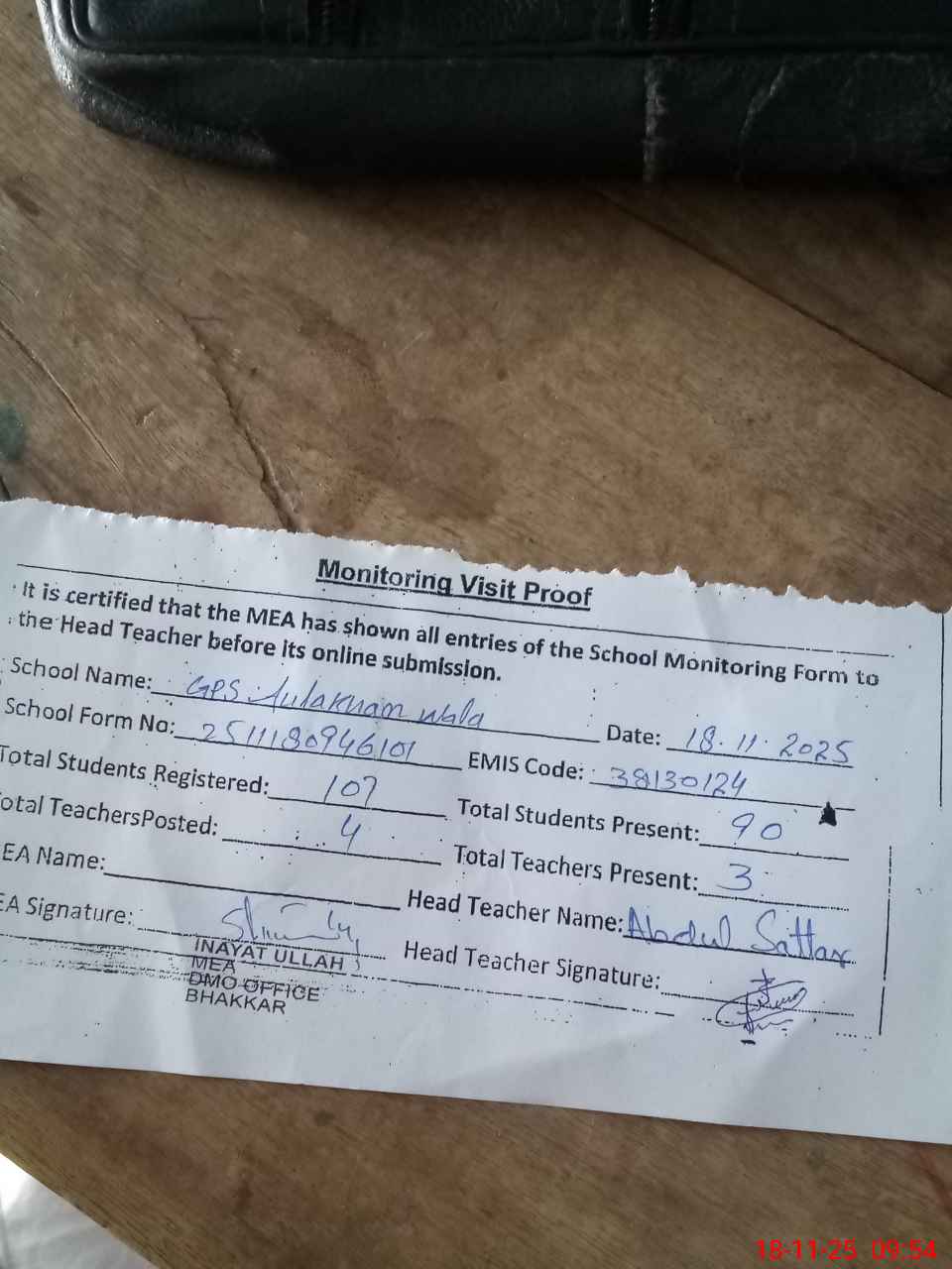 | Attendance Register | Head Teacher | MEA with School | Visit Proof |