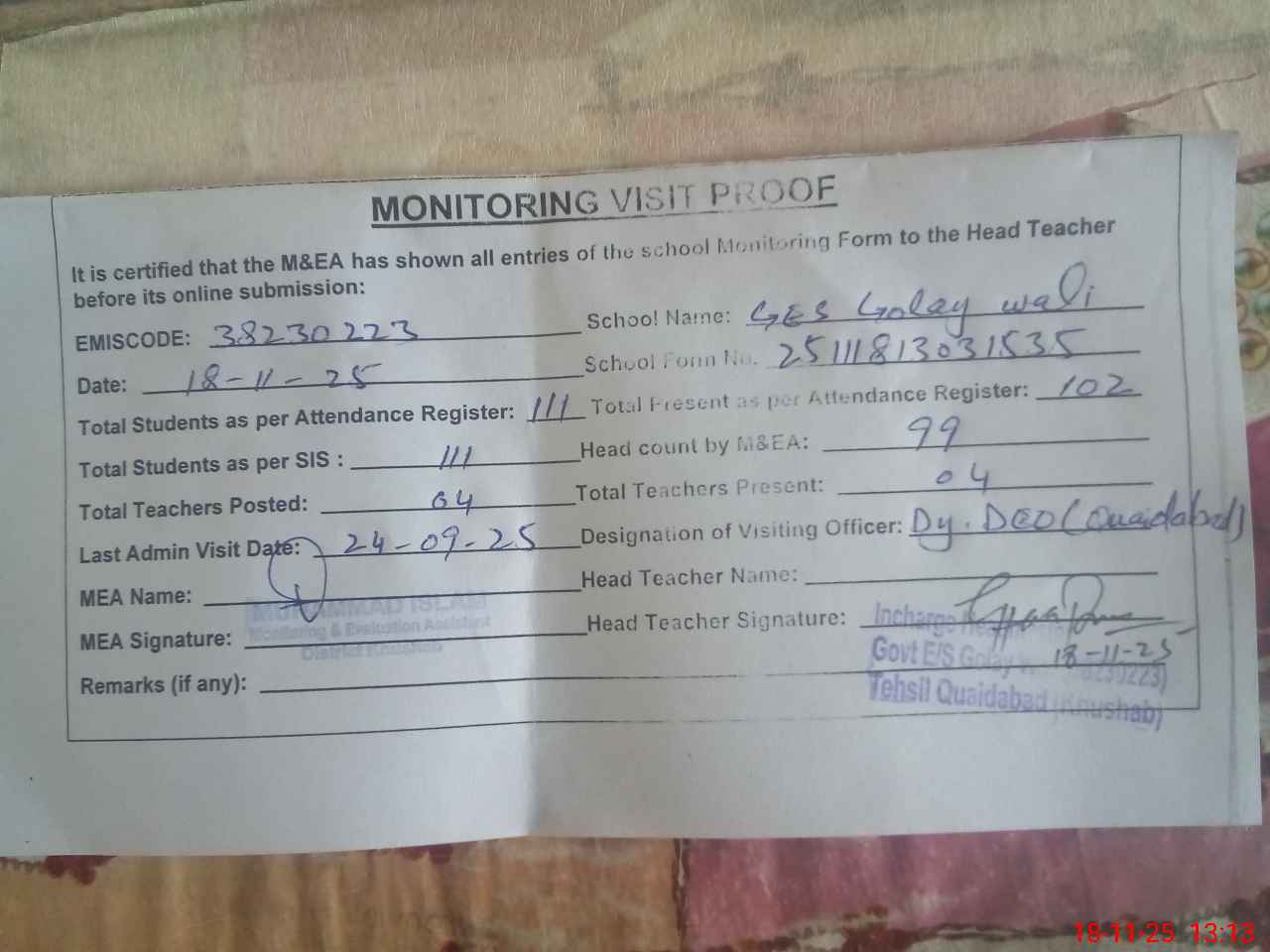 | Remarks (Use Separate Page if Required): Dy DEO visited school on 24 September 2025 Students strength on sis 111 School elementary portion have no boundary wall and no gate | |||||